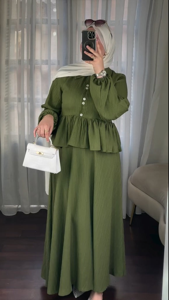 Chic aur sophisticated, this Skiet set blends elegance with comfort. The peplum style top with delicate buttons, paired with a graceful flared skirt, makes it the perfect choice for both casual outings and formal gatherings.