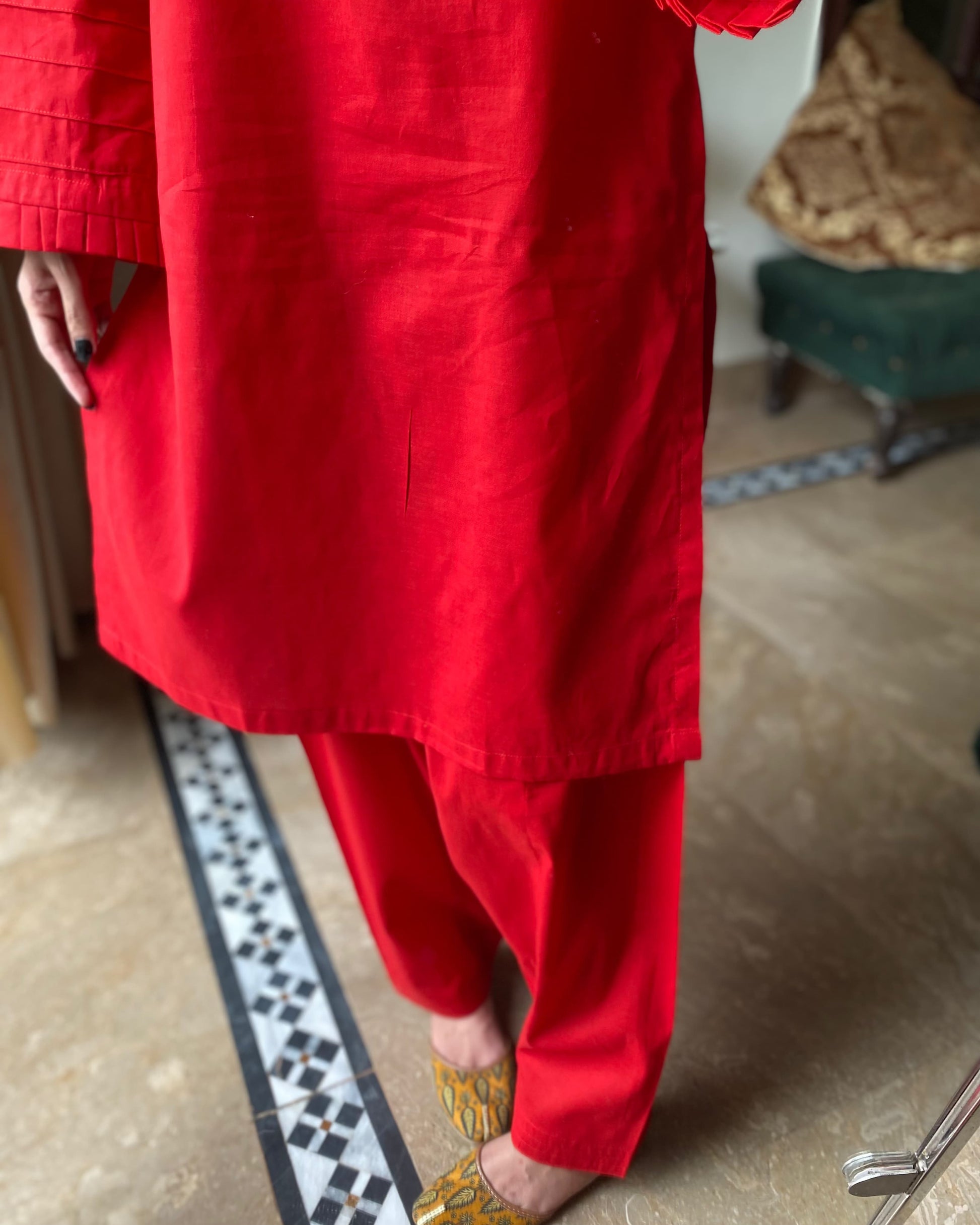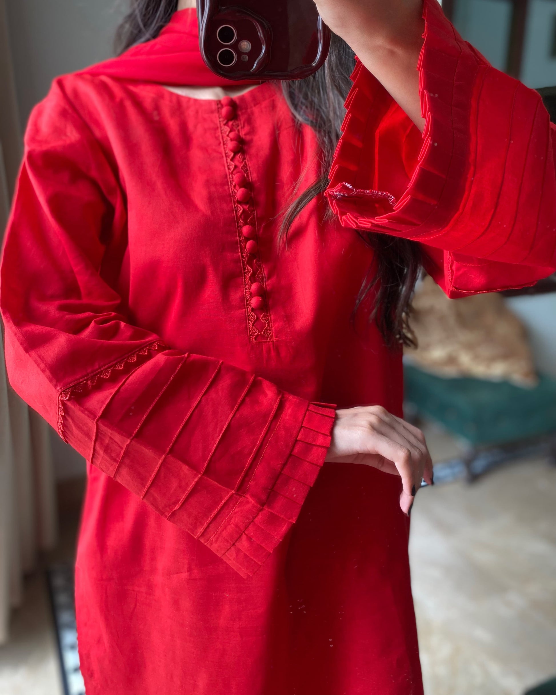 The Red Blossom 3 Piece Set features a traditional red shalwar kameez with a soft matching dupatta, designed for comfort and grace. The minimalistic style allows you to dress it up with accessories or keep it simple for daily wear. Made from breathable fabric